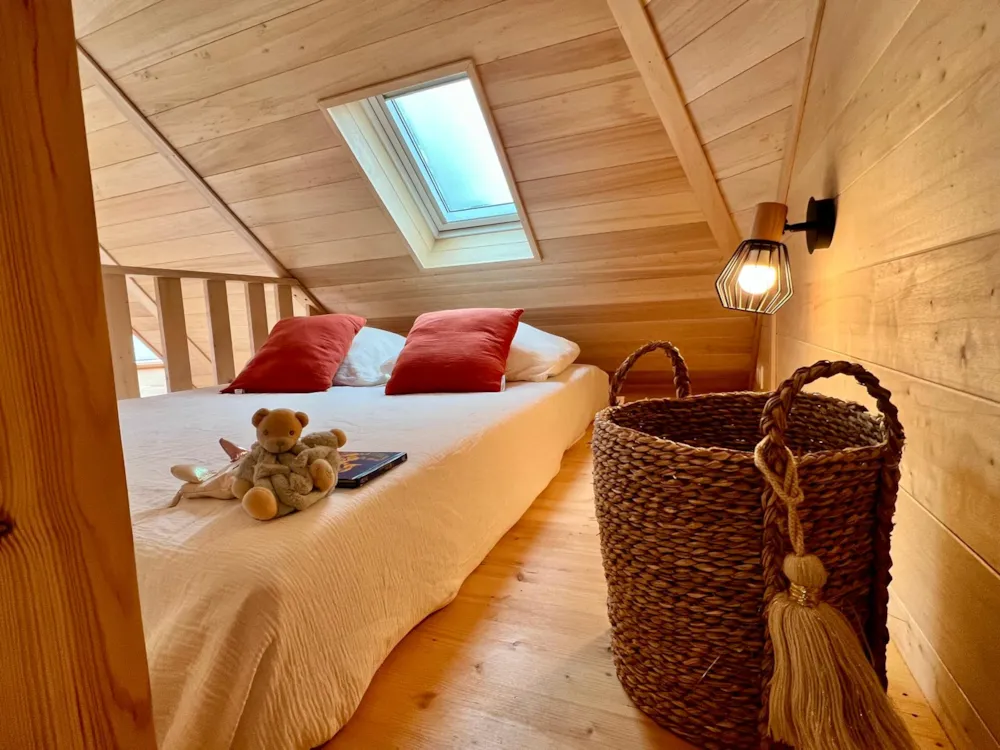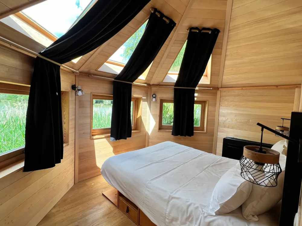 Baignée dans la nature par ses nombreuses fenêtres aux formes originales, dans cette cabane vous pourrez faire l’expérience d’admirer une belle nuit étoilée confortablement installés dans votre lit douillet.