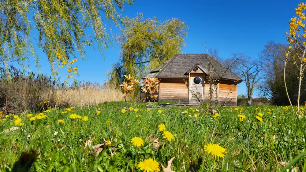 Petit chalet en bois de forme octogonale, c’est un véritable cocon tout confort.
